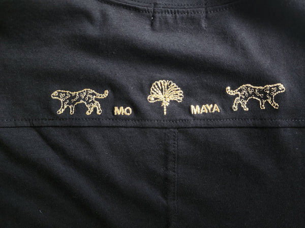 This black crop t-shirt showcases intricate embroidered leopards on the back, blending bold artistry with modern style. Its cropped design provides a contemporary fit, while the detailed embroidery offers a unique, eye-catching element that elevates your casual wardrobe with a distinctive, expert-crafted touch.
